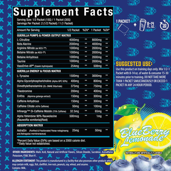 El Jefe Guerilla may provide an epic pre workout experience without exotic stimulants. Long lasting energy from 3 different forms of caffeine and other stimulants that amplify the stim experience.*