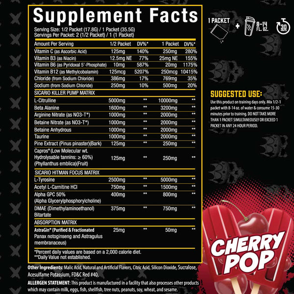 Sicario utilizes 20 ingredients to enhance your pumps, performance and provide laser focus.*