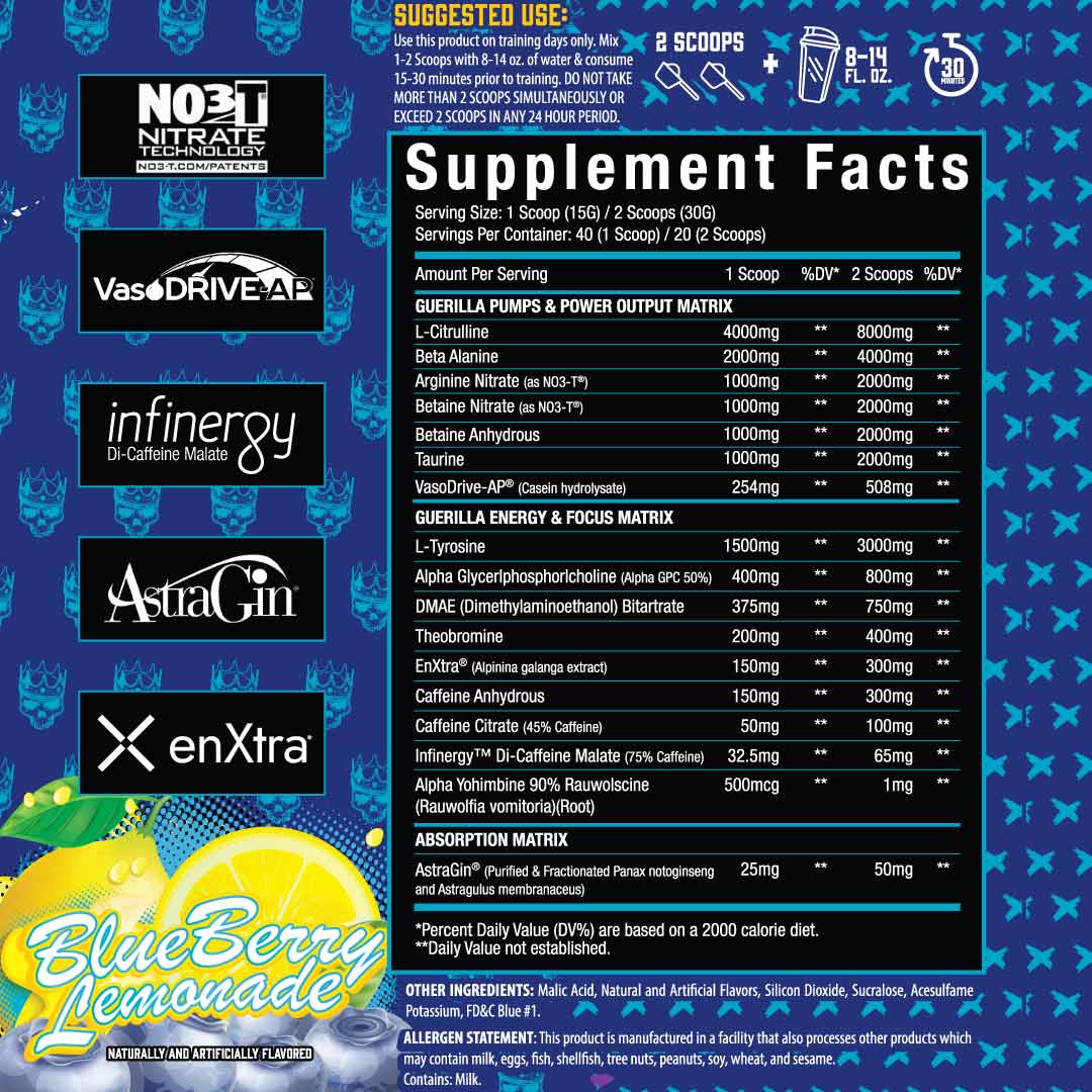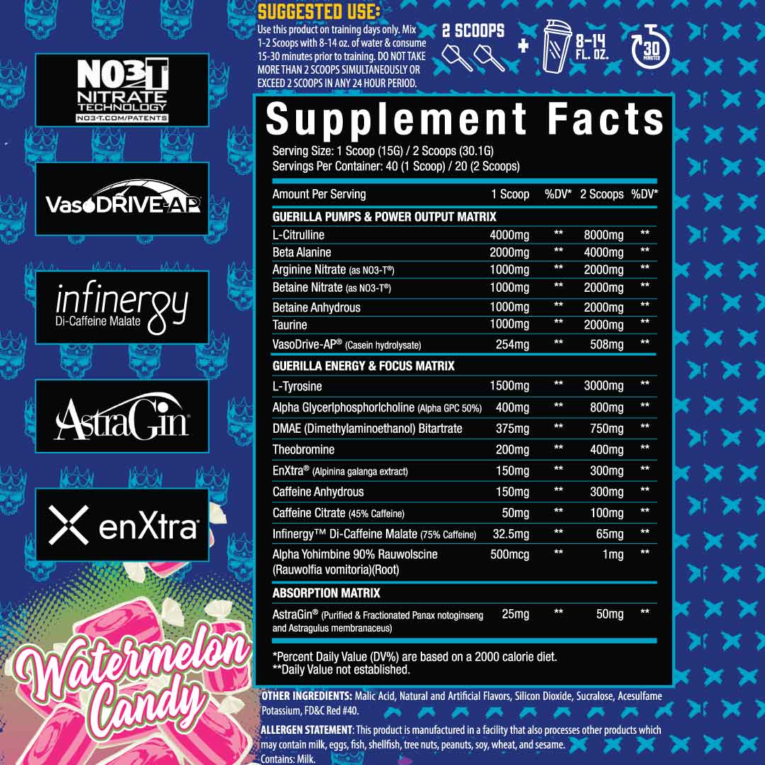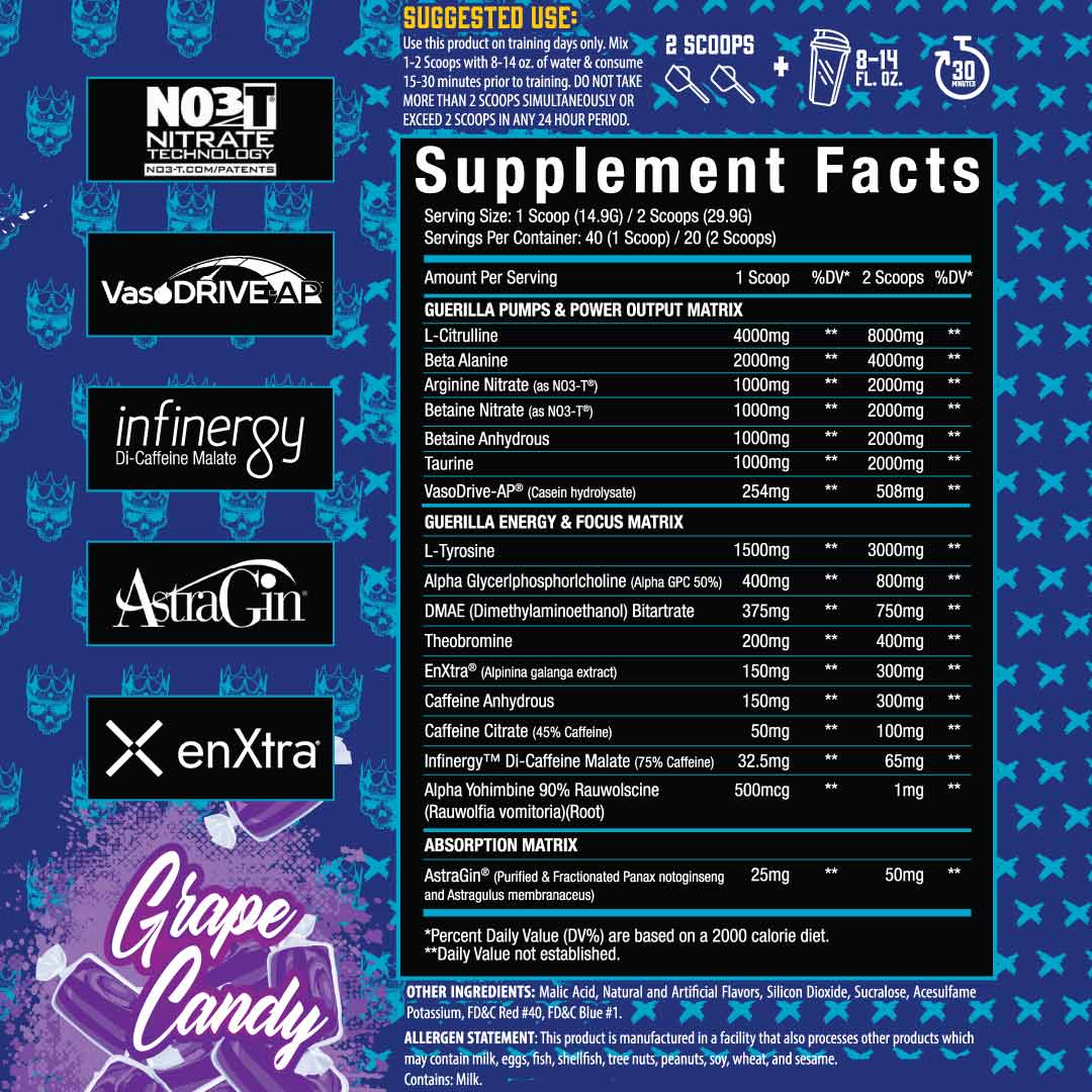El Jefe Guerilla may provide an epic pre workout experience without exotic stimulants. Long lasting energy from 3 different forms of caffeine and other stimulants that amplify the stim experience.*
