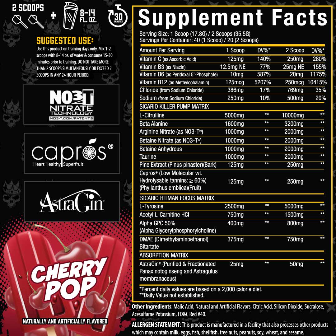 Sicario utilizes 20 ingredients to enhance your pumps, performance and provide laser focus.*